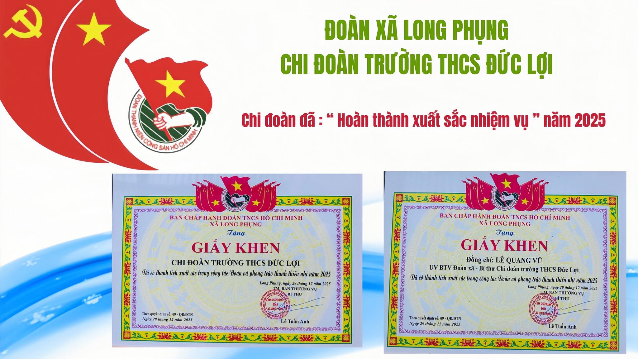 Đặc biệt, đồng chí Lê Quang Vũ – Ủy viên Ban Thường vụ Đoàn xã Long Phụng, Bí thư Chi đoàn Trường THCS Đức Lợi cũng vinh dự được nhận Giấy khen vì đã có thành tích xuất sắc trong công tác Đoàn và phong trào thanh thiếu nhi năm 2025. Đây không chỉ là niềm tự hào cá nhân mà còn là niềm vui chung của tập thể nhà trường.